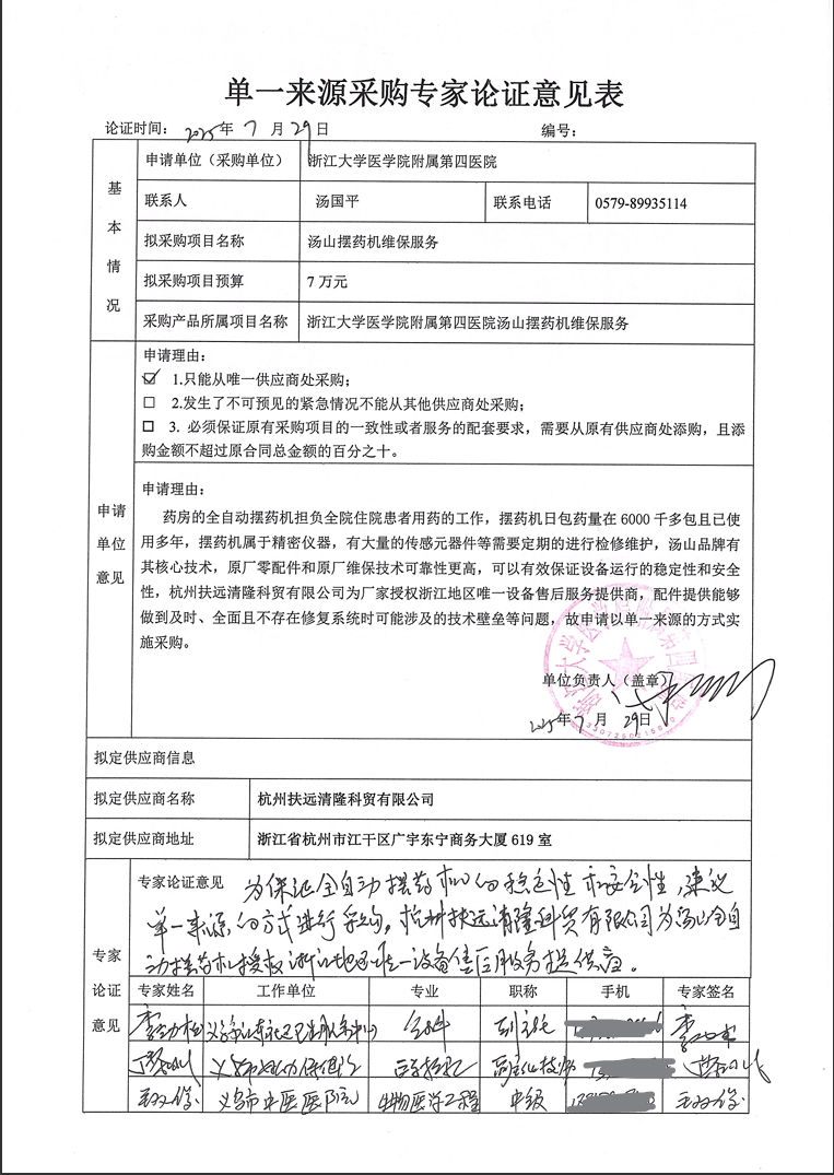 本项目为我院片剂全自动分包机的维保服务采购,摆药机担负全院住院患者用药的工作,摆药机属于精密仪器,有大量的传感元器件等需要定期的进行检修维护,汤山品牌有其核心技术,原厂零配件和原厂维保技术可靠性更高,可以有效保证设备运行的稳定性和安全性,杭州扶远清隆科贸有限公司为厂家授权浙江地区唯一设备售后服务提供商,配件提供能够做到及时、全面且不存在修复系统时可能涉及的技术壁垒等问题。因此,特申请单一来源的采供方式进行采购。