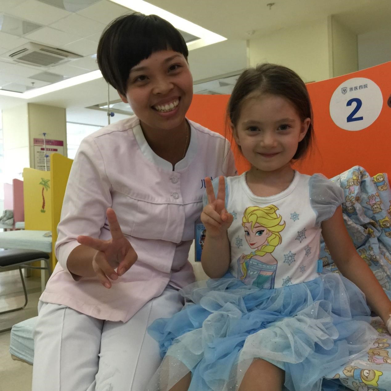 第二天,艾美莉跟着爸爸来复诊的时候,小女孩已经能自己走路了,脸色也不再是之前的苍白如纸,穿着淡蓝色的公主裙,羞涩的朝我们甜甜一笑,用中文说了一句“谢谢”!