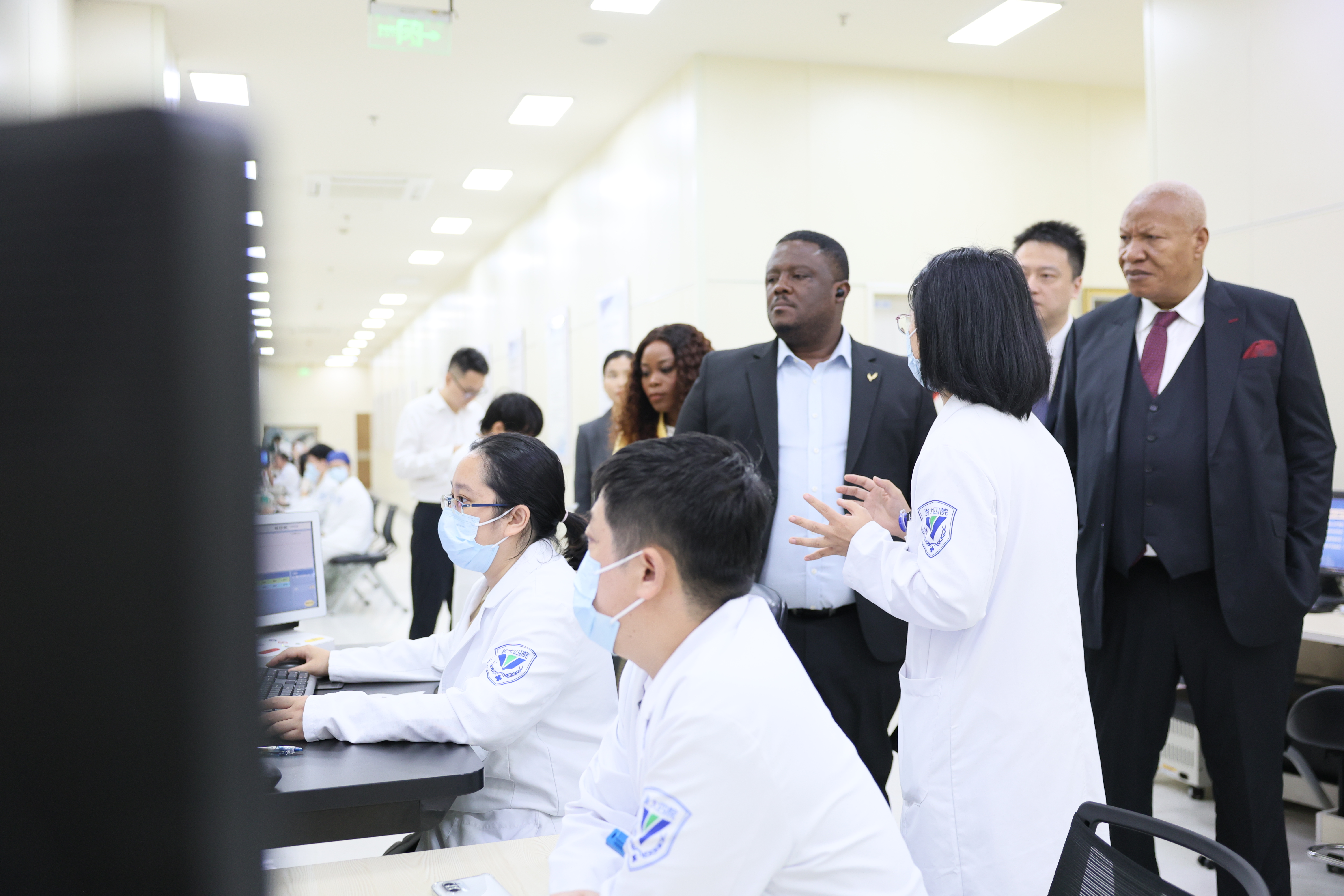 浙大四院院长吴李鸣陪同代表团参观门诊大楼、住院部,深入名医馆、国际保健中心、呼吸医学中心、国际医疗部、智慧药房、放射科、检验科等科室。期间,代表团详细了解医院现代化设施设备配置、智能化管理系统运行及人性化服务模式开展情况,对医院在医疗技术创新、国际医疗服务等方面取得的成效给予高度评价。