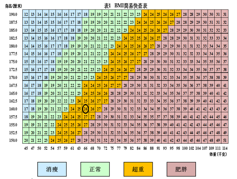 如:张某某,身高160厘米,体重66千克。通过下面的简易快查表可知其体重指数为26,属于超重。