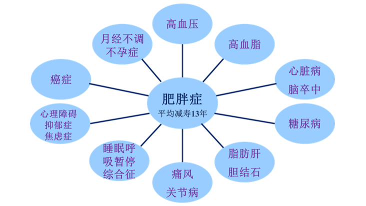 肥胖会对人体各个系统产生不同程度的危害,常见疾病如下图: