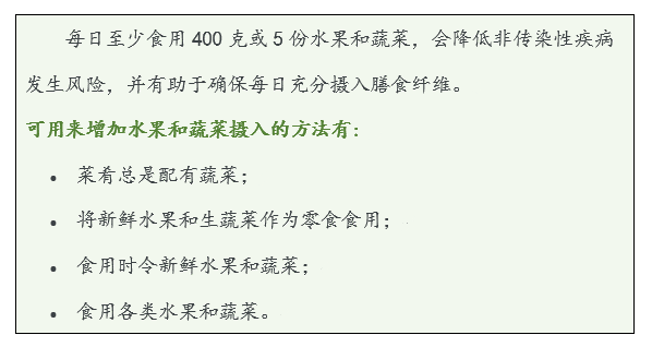 二、 每天至少食用400克(即5种)水果和蔬菜,不包括土豆、红薯、木薯和其它淀粉类根茎食物。