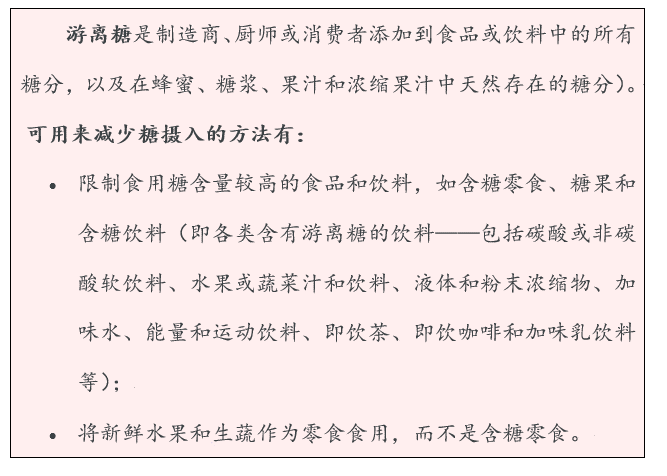 三、 在摄入的总能量中,不到10%的能量来自游离糖(这对于每天消耗约2000卡路里,体重正常的个人而言相当于50克)。