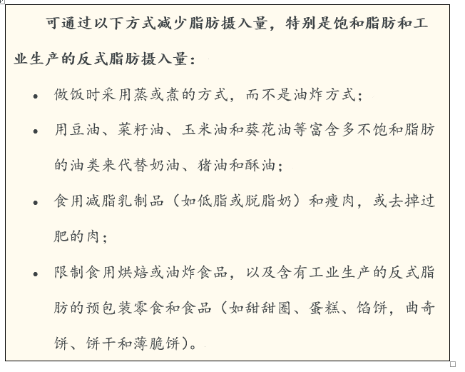 成年人将摄入的脂肪总量减至总能量的30%以下,会有助于防止体重过重。还可以通过以下方式降低罹患非传染性疾病的风险: