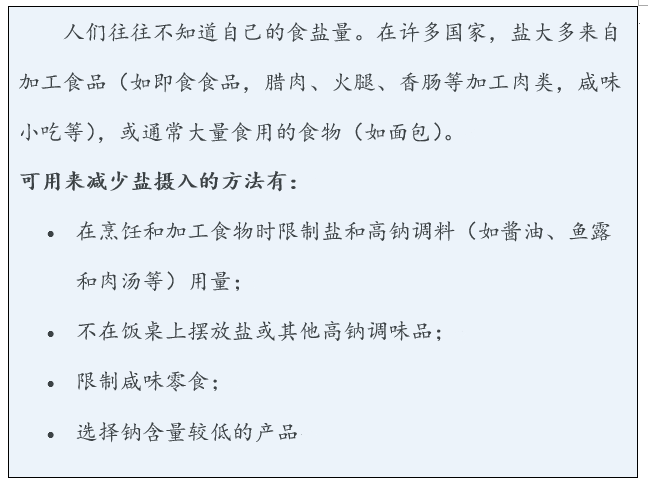 五、 每日食盐量低于5克(相当于大约一茶勺),相当于每日钠摄入量不超过2克),有助于预防高血压并降低成年人罹患心脏病和中风的风险。食盐应得到碘化。