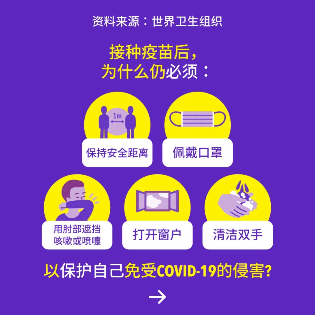 保持人际距离、勤洗手、咳嗽时遮挡口鼻、佩戴口罩、多通风、接种疫苗……我们仍要采取所有防疫措施来保护自己,并帮助终止疫情。
