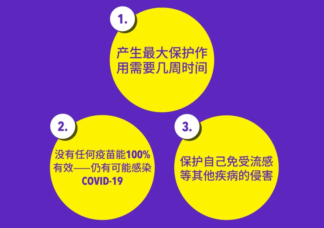 因为疫苗产生最大保护作用需要几周时间,并且没有任何疫苗能100%有效,所以我们仍有感染COVID-19的可能性。