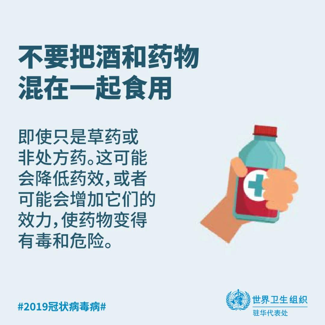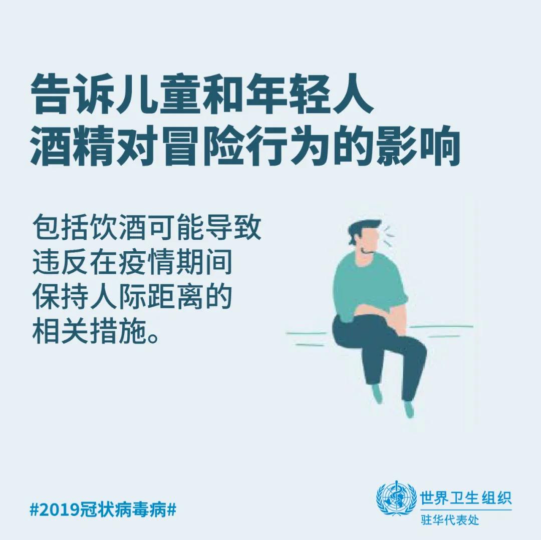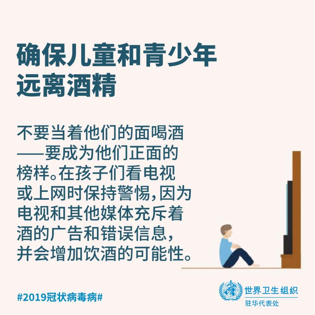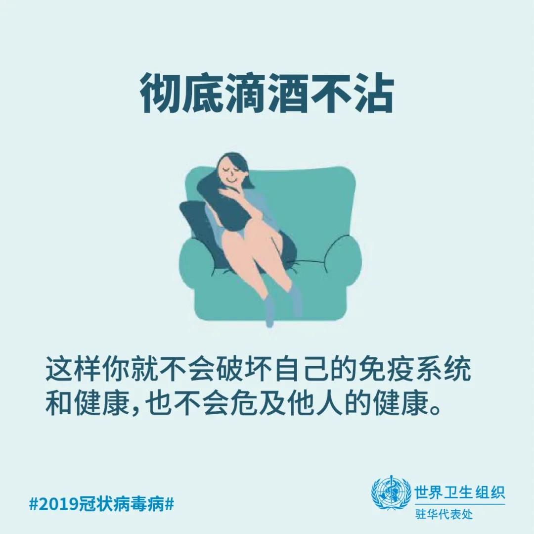 在任何情况下喝酒都不能给你提供任何保护,既不能预防也不能治疗2019冠状病毒病。恰恰相反的是,饮酒有害健康。含酒精饮品不仅是一种致癌物,会增加罹患多种癌症类型的风险,更与一系列传染性和其他非传染性疾病以及精神健康疾病密切相关。在公共卫生危机发生时,饮酒只会通过危害您的健康,使您处于更加脆弱的境地。