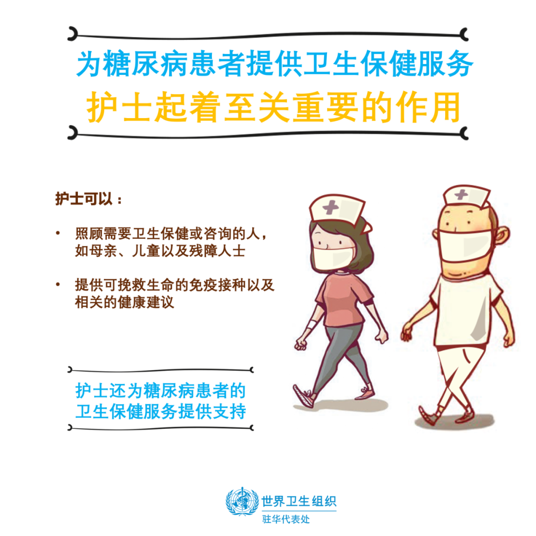 今年世界糖尿病日的主题是“护士大有作为”。护士为各种卫生健康服务提供着重要支持,是维护糖尿病患者基本卫生服务的核心。经过适当的培训,他们在糖尿病的诊断、治疗和康复中可发挥关键作用。