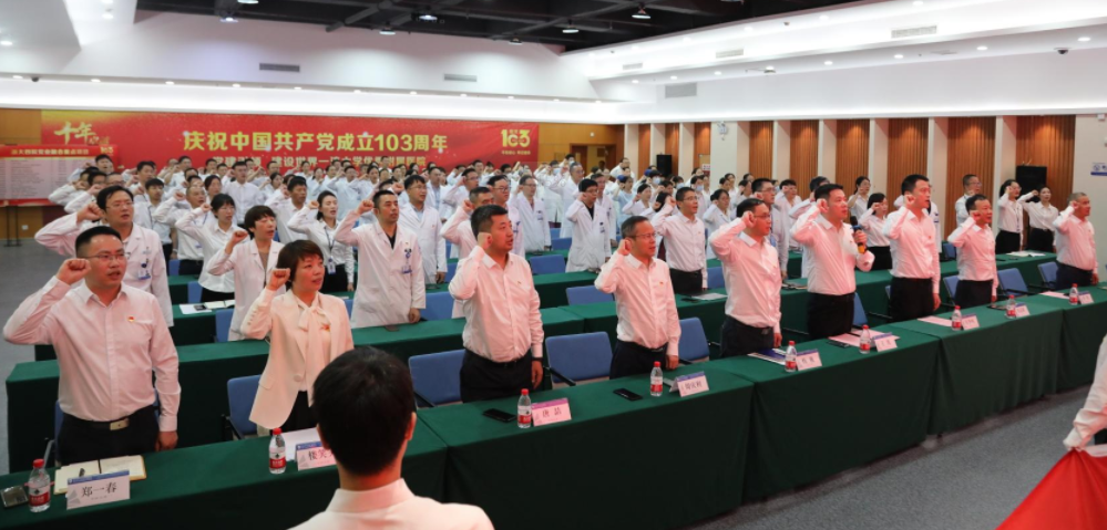 党委书记王凯带领全体党员面向党旗重温入党誓词,不忘入党初心、回顾入党历程,以实际行动践行誓词,以饱满热情发挥先锋模范作用,用实际行动为医院和国际医学院高质量发展贡献力量。