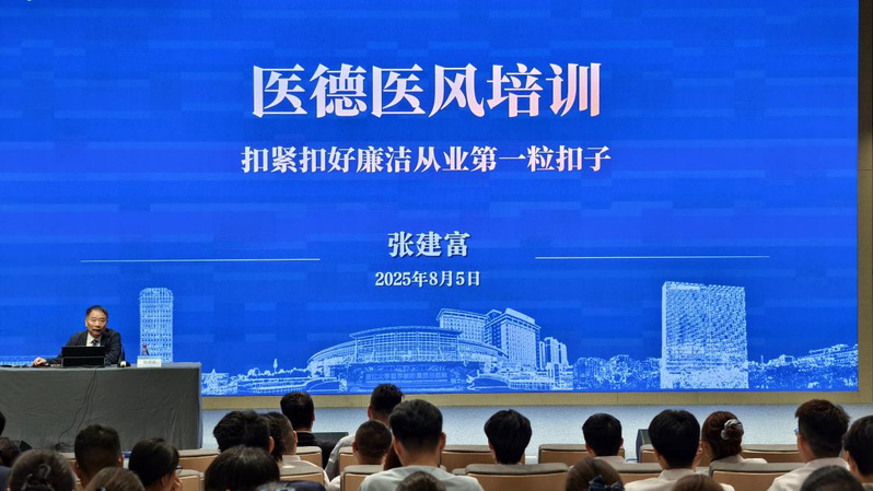 8月5日,浙大四院党委副书记、纪委书记张建富为全体2025届新员工讲授“医德医风——扣紧扣好廉洁从业第一粒扣子”专题课程。课程围绕当前医药领域反腐形势、医德医风核心内涵、廉洁从业纪律要求等内容展开,既有理论阐释,又有案例剖析。